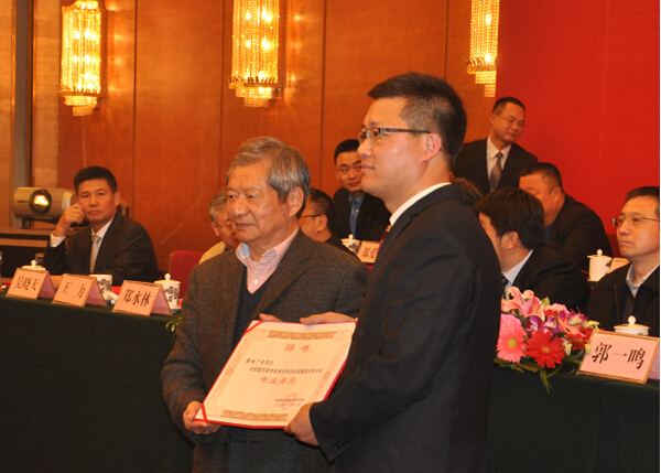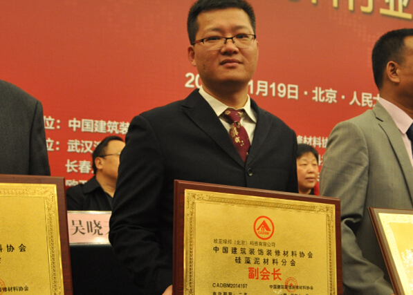 中國(guó)建筑裝飾裝修材料協(xié)會(huì)會(huì)長(zhǎng)郭一鳴為中國(guó)硅藻泥行業(yè)協(xié)會(huì)常務(wù)副會(huì)長(zhǎng)趙廣全頒發(fā)證書